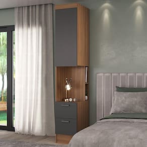 O dormitório modulado Viena foi desenvolvido para atender suas necessidades de uso de espaço, sendo ideal para quartos compactos e modernos, aproveitando de forma inteligente seu ambiente de forma espaçosa, prática e de alta qualidade. Altura do Estrado até o Chão: cm Altura do Estrado Superior até o Chão: cm Altura dos Pés: cm Ambiente Principal: Quarto Cama Auxiliar Suporta Até (kg): kg Complexidade da Montagem: Média: pode ser montado por mais de uma pessoa e/ou necessite de maior conhecimento para montagem Composição: 100% MDP Cor: Nogal/Grafite Cor do Produto: Nogal/Grafite Escala de Brilho: Fosco Espessura do Espelho: mm Espessura do Material da Estrutura: 15 mm Espessura do Vidro: mm Informações Complementares: Acabamento em Finish Foil e dobradiça com amortecedor pistão. Itens Inclusos: 1 Módulo, Kit Ferragens e Manual de Montagem Largura do Colchão Indicado: cm Linha ou Coleção: Linha Viena Manual de Montagem e Instalação: https://cdn2.madeiramadeira.com.br/atributo/hecol-moveis/1318759-manual-de-montagem-vn-8003.pdf Material Principal: MDP Necessita Montagem: Sim O Módulo Pode ser utilizado individualmente: Sim Origem do Produto: Nacional Peso: 39 kg Peso da Banqueta: kg Peso Máximo por Gaveta: kg Peso Máximo por Prateleira: kg Peso Suportado pela Banqueta: kg Peso Suportado por cada cama: kg Recomendações de Uso, Manutenção e Limpeza: Utilizar Pano Úmido Sistema de Montagem: Minifix, Parafusos e Cavilhas Suporta Até (kg): kg Tipo de Módulo: Mesa de Cabeceira