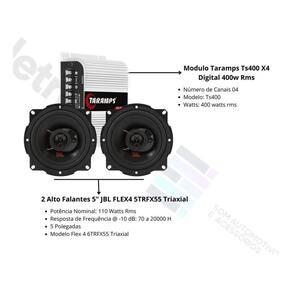 O kit inclui o Módulo Taramps TS400x4, um amplificador de quatro canais com 400 watts RMS, e um par de Alto Falantes 5 JBL FLEX4 5trfx55, cada um com 110 watts RMS. Essa combinação proporciona uma potência significativa e qualidade sonora excepcional para aprimorar o sistema de áudio do veículo. O amplificador Taramps oferece versatilidade, enquanto os alto-falantes JBL garantem agudos cristalinos e graves profundos. Ideal para entusiastas de áudio automotivo em busca de uma experiência sonora envolvente e de alta qualidade.