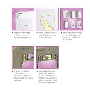 - Acabamento branco brilhante e sem parafusos; - Uma linha com diversas opções de funções para compor a combinação necessária; - Ajuste gradual da placa ao suporte proporciona perfeito acabamento entre placa e parede; - Teclas largas são mais ergonômicas e suaves no acionamento;