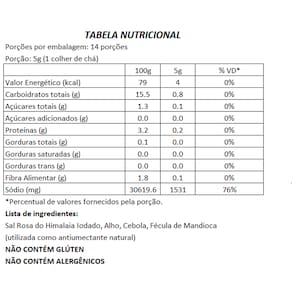 Sal Rosa do Himalaia Iodado, Alho, Cebola e Fécula de Mandioca (utilizada como antiumectante natural)