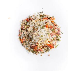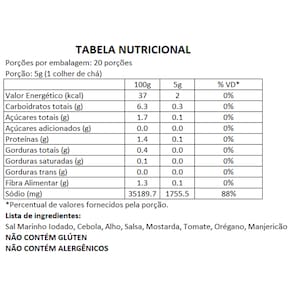 Sal Marinho Iodado, Cebola , Tomate , Alho , Pimentão Vermelho, Mostarda , Salsa, Orégano, Manjericão, Cebolinha Verde, Louro e Alecrim
