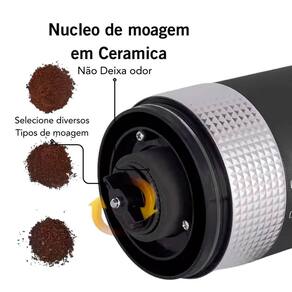 Material das lâminas: Rebarba de cerâmica cônica Bateria: Li-pol 3.7V de 1250mAh Tempo de recarga: 1h30min via USB-C Potência: 13W Ruído: Inferior a 65 dB Dimensões: 18,8 cm de altura x 7,5 cm de largura Capacidade do funil: 30g de grãos Capacidade do recipiente: 120ml de café moído