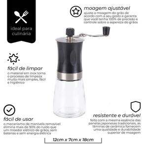 - Material: Vidro - Estrutura em aço inox - Triturador em cerâmica - Regulagem para nível de moagem - Design compacto e moderno