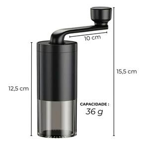 FICHA TÉCNICA: Tipo: Moedor de café manual Cor: Preto com recipiente transparente Material: Plástico ABS resistente e núcleo em cerâmica Capacidade: até 36g de café em grãos Ajuste de moagem: Sim (de fino a grosso) Dimensões aproximadas: 15 cm de altura x 5 cm de diâmetro Peso: leve e fácil de manusear