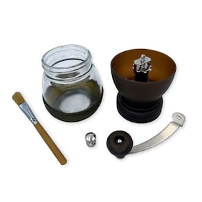 Moedor De Café Manual Vidro Plástico Inox Cerâmica 1. Para ajustar a moagem, desrosqueie o pino, retire a manivela e o anel de Segure o eixo e gire o anel de ajuste. Sentido horário para moagem mais fina e do contrário para moagem mais Reposicione o anel de trava, recoloque a manivela e rosqueie novamente o pino. Cuidados:- Lavar apenas com água, esponja macia e detergente neutro. Não levar na lava-louças.- Manter longe do alcance de crianças. Cuidado com batidas fortes e quedas. ESPECIFICAÇÕES: Dimensões: 20 x 9cmMaterial: Plástico e Vidro Manual Contém: Moedor De Café Manual Vidro Plástico Inox Cerâmica - Marrom