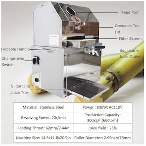 Alta eficiência Entrada de energia 800W Capacidade máxima 300Kg , h.Esta impressora de cana de açúcar foi projetada com transmissão de engrenagem de 5 graus para menor consumo de energia, acionado por motor pesado e controlado pressionando os botões para ligar ou desligar. Possui três rolos de aço inoxidável, pode esmagar a bengala com resultados muito perfeitos. Fácil de limpar Feito de aço inoxidável e construído com motor 100 cobre, antiferrugem e cheio de energia. Abra a concha acima do rolo de aço, você pode limpar os rolos convenientemente. Limpe a tempo para evitar ferrugem. Chave de troca Chave de mudança para controlar os rolos para rotação no sentido horário ou no sentido anti horário. Quando a máquina estiver presa, use esse interruptor para mudar de direção. Preste atenção Quando a nova máquina estiver funcionando por mais de meia hora, o motor emitirá fumaça. Esse fenômeno é ca pelo calor do lubrificante dentro do motor. Se a máquina estiver funcionando corretamente, é normal soltar um pouco de fumaça Marca: Não Informado