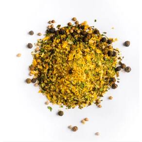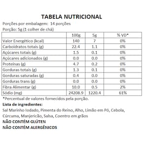 Sal Marinho Iodado, Pimenta do Reino Preta, Alho, Limão em Pó, Cúrcuma, Cebola, Manjericão, Salsa, Coentro e Farinha de Mandioca