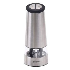 Moedor elétrico duplo para sal e pimenta com corpo em aço inoxidável escovado, mecanismo de moagem em cerâmica e câmaras transparentes em acrílico. Operação automática com o toque de um botão.Base recarregável