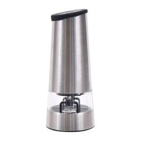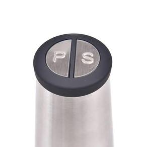 Moedor elétrico duplo para sal e pimenta com corpo em aço inoxidável escovado, mecanismo de moagem em cerâmica e câmaras transparentes em acrílico. Operação automática com o toque de um botão.Base recarregável