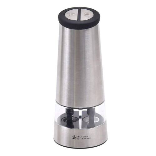 Moedor elétrico duplo para sal e pimenta com corpo em aço inoxidável escovado e câmaras em acrílico transparente. Possui mecanismo de moagem em cerâmica de alta durabilidade e operação automática com o toque de um botão.Desmontável