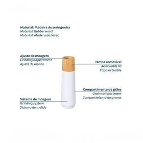 - Moedor em madeira seringueira com pino regulador de tamanho de grão, para que seja ajustado conforme seu gosto.