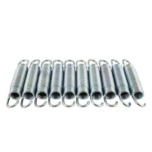 Este kit com 10 unidades é ideal para substituição de molas desgastadas, auxiliando na preservação da estrutura e na vida útil do equipamento. A troca periódica ajuda a manter o funcionamento correto da cama elástica e evita sobrecarga na lona e nos pontos de fixação.