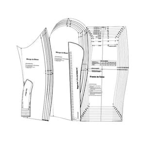 + Régua de 1/4 para acinturar + Régua saia e calça + Manga do Blazer Superior + Manga do Blazer inferior + Colarinho da Camisa + Frente Camisa + Costa Camisa + Manga da Camisa + Frente da blusa + Costas da Blusa + Manga da Blusa + Gola Militar + Gola Esporte + Gola Italiana + Frente de Calça + Costas da Calça