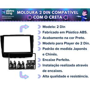 A moldura 2 Din preta para o automóvel Creta, especificamente de origem japonesa ou chinesa, é um acessório automotivo projetado para permitir a instalação de um aparelho de som ou multimídia de 2 Din no painel do veículo. A expressão 2 Din refere-se ao padrão de tamanho duplo DIN, que é o dobro da altura de um aparelho de som padrão DIN simples, com dimensões aproximadas de 180 mm x 100 mm.