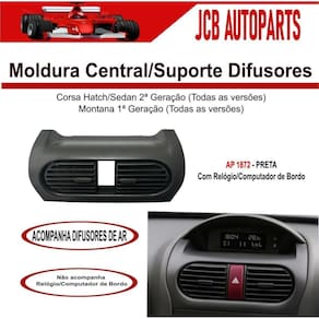 Moldura Central/Suporte Com Difusores Versão Com Relógio/Computador de Bordo APLICAÇÃO: Corsa Hatch 2Geração Todas as versões Corsa Sedan 2Geração Todas as versões Montana 1Geração Todas as versões COR: PRETO ESPECIFICAÇÕES TÉCNICAS: Fabricada em Plástico Resistente Longa Durabilidade Excelente Acabamento Fixação Firme e Encaixe Perfeito Fácil Instalação Acompanha Difusores de Ar Não acompanha Relógio/ Computador de Bordo CONTEUDO DA EMBALAGEM: 01 Moldura Painel Central 02 Difusores de Ar : de 3 meses sobre defeitos de fabricação; Não nos responsabilizamos pelo mau uso ou instalação inadequada do produto; Recomendamos que a instalação seja feita por profissional especializado. A JCB agradece sua preferência estamos à disposição para melhor atendê-los Marca: Não Informado