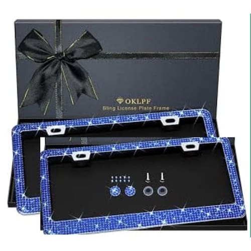 Pacote com 2 molduras de placa de oficial azul escuro, suporte de placa de carro de diamante brilhante, adequado para homens e mulheres, vem com tampa de rosca, parafuso, arruela.
