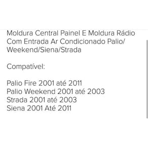 Descrição do produto Moldura painel central e radio palio siena fire co Mais informações Marca: 67781 Descrição completa Moldura painel central e radio palio siena fire com ar condi Moldura central painel e moldura rádio sem ar condicionado palio/weekend/siena/strada Compatível: Palio fire 2001 até 2011 Palio weekend 2001 até 2003 Strada 2001 até 2003 Siena 2001 até 2011 Obs: siena e palio, a moldura central é compatível compatível com as versões fire, economy e celebration. Conteúdo da embalagem: de 3 meses Valor unitário Especificação técnica: Moldura central + moldura rádio sem ar condicionado Fabricado em plástico resistente Moldura na cor cinza Fácil instalação realizada através de encaixes Conteúdo da embalagem: 01 moldura central e moldura radio Importante: de 3 meses. Valor unitário. Agradecemos a sua visita Marca: Não Informado