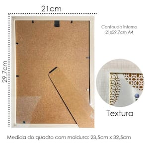 - Quantidade: 01 - Composição: Vidro E Plástico - Moldura: Texturizada - Cor moldura: Branco - Medida total do Quadro: 23 x 32 cm - Medida Conteudo interno: A4 = 21 x 29,7cm Marca: Inter.P