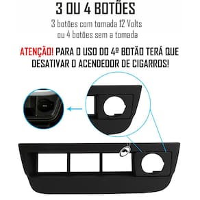 DESCRIÇÃO:- Disponível na cor PRETO;- Com essa moldura você tem a opção de 3 retangulares e 2 botões dos cantos;- Encaixe perfeito e de fácil instalação/utilização;- Longa durabilidade;- Excelente acabamento;- ATENÇÃO! Para o uso do 4º botão terá que desativar o acendedor de ci.garros.