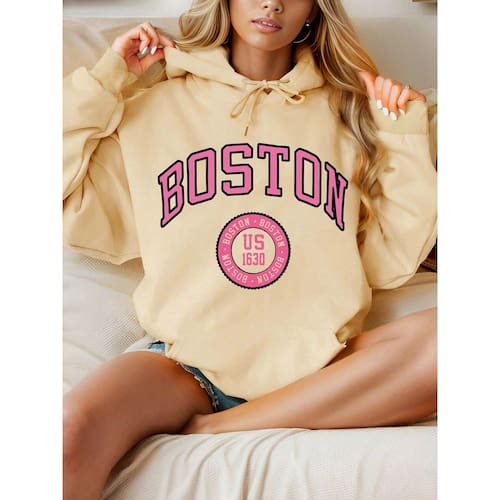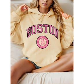 [Design Moderno] A estampa "Boston" rosa adiciona um toque de cor vibrante, que combina perfeitamente com o bege do moletom. É uma combinação que faz qualquer look casual se destacar sem esforço.