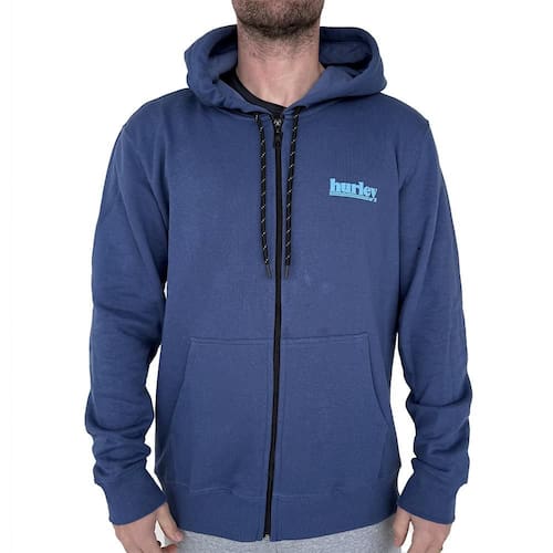 Moletom Hurley Aberto 250g, estampa frontal, capuz com cordão, bolso canguru com etiqueta e etiquetas personalizadas.