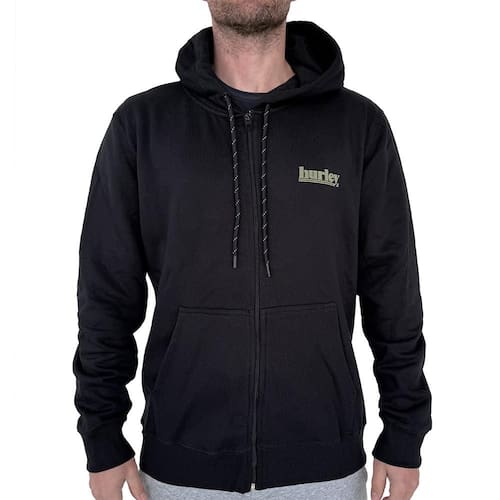 Moletom Hurley Aberto 250g, estampa frontal, capuz com cordão, bolso canguru com etiqueta e etiquetas personalizadas.