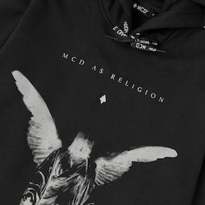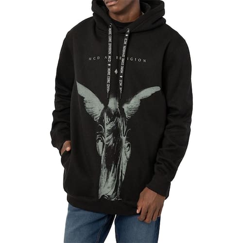 Moletom MCD com bolsos laterais embutidos, capuz com forro e cadarços ajustadores, estampa frontal, punhos e barra com elástico para maior proteção.