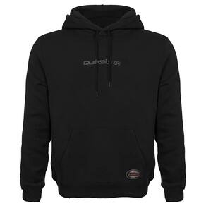 Moletom QuikSilver fechado, bordado aplicado no peito, etiqueta aplicada no lado esquerdo do capuz e etiquetas personalizadas.