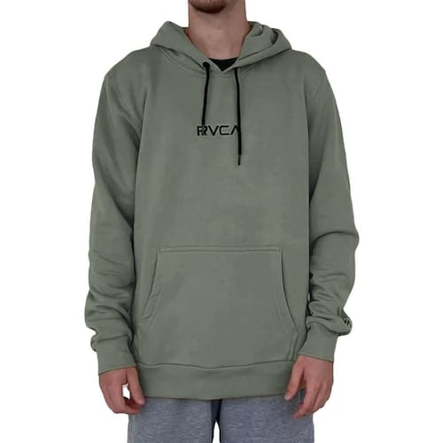 Moletom RVCA canguru fechado 320g, bordado RVCA small frente, punhos em ribana na barra da manga e corpo e etiquetas personalizadas.