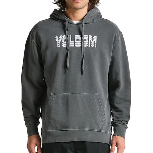 Moletom Volcom feito em modelagem regular, silk frente e costas, sem felpa, bolso canguru e lavanderia efeito estonado.