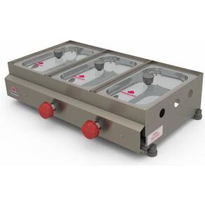 - Estrutura em aço inoxidável; - 3 cubas; 5cm A x 26cm L x 16cm P cada . - 2 Queimadores posicionado abaixo de duas cubas, NÃO tem banho Maria. - Tampos de vidro - Utilização com botijão. - Pezinho borracha. - Gaveta PR-03 G completa - Trabalha á gás GLP baixa pressão . - Consumo médio: 0,200 Kg/h - Peso Líquido: 7,4 Kg - Peso Bruto: 8,5 Kg - Medidas internas cada cuba: 5cm A x 26cm L x 16cm P - Medidas externas: 16cm A x 59cm L x 35cm P - Medidas embalagem: 18cm A x 61cm L x 38cm P Ean: 7890100014341