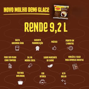 Principais aplicações - Base para os mais diversos molhos escuros - Base para estrogonofe - Base para risotos - Rendimento de 9,2 litros
