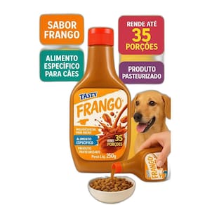Molho Especial Para Ração Cães Sabor Frango 250g O Molho Tasty Sabor Frango foi desenvolvido para tornar a ração do seu cão muito mais saborosa e atrativa. Fácil de usar, basta adicionar sobre a ração seca para estimular o apetite e proporcionar uma refeição mais prazerosa. Benefícios: