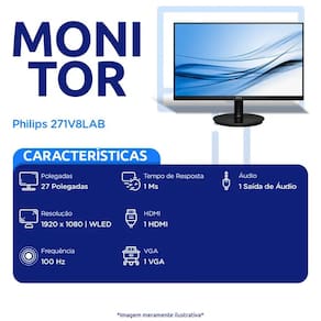 Monitor 271V8LAB  W-LED 27 Polegadas Widescreen Full HD HDMI VGA Philips