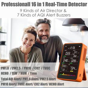 - ?Monitor de qualidade do ar 16 em 1 em tempo real?: Com detecção em tempo real de PM1.0 | PM2.5 | PM10 | CO2 | TVOC | HCHO | TEM | HUM, juntamente com 7 tipos de função de alarme AQI, este monitor garante que você sempre saiba o que está no ar ao seu redor.