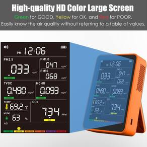 - ?Sistema de sensor de alta precisão e tela grande HD?: O sistema de sensor de alta precisão coleta e analisa continuamente os dados do ar a cada 3 segundos, fornecendo atualizações constantes sobre a qualidade do ar em seu espaço. Uma tela colorida clara e avançada melhora a legibilidade e adiciona um toque de sofisticação ao seu ambiente.