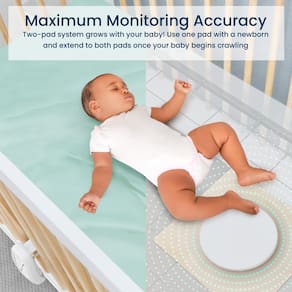 - Monitoramento de movimento sob o colchão: agora com maior sensibilidade – este dispositivo altamente sensível sem toque monitora os micromovimentos do bebê através do colchão. Inclui duas almofadas de sensor para cobrir toda a área do berço sem tocar o bebê ou atrapalhar o sono do bebê.