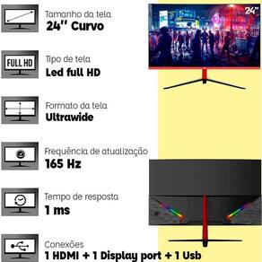 RESUMINDO: - 1ms de tempo de resposta - Não seja pego de surpresa pelos seus concorrentes, tenha respostas em tempo real. - Taxa de atualização de 165hz - Cenas mais que perfeitas e imagens incríveis, mesmo em jogos com alto FPS. Você está seguro, afinal são 165hz. - Constraste fora do comum - Imagens vivas e nítidas com a taxa de contraste de 50000:1 - Tela curva - Imersão total, com a sensação de estar dentro do jogo. - Display port - Conexão avançada para o aproveitamento máximo dos recursos do monitor