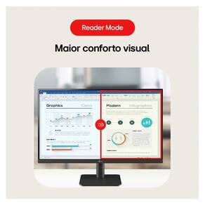 Para completar, conta com recursos de conforto visual, como o Reader Mode e o Flicker Safe, que reduzem a emissão de luz azul e o flicker, evitando o cansaço visual. Com formato Widescreen, tem painel IPS, conexão HDMI (2ea), recurso OnScreen Control com controle de várias configurações de exibição de tela, ângulo de visão de 178º com imagens claras de qualquer ângulo e design de 3 lados praticamente sem bordas.