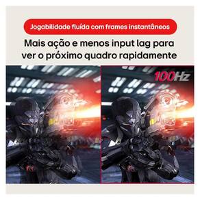 Além disso, conta com frequência de atualização de 100Hz e tempo de resposta de 5ms, garantindo fluidez e realismo nas imagens. Também possui recursos que otimizam a experiência de jogo, como o Dynamic Action Sync, que reduz o atraso de entrada, o Black Stabilizer, que melhora a visibilidade em cenas escuras, e o Crosshair, que exibe uma mira na tela para ajudar na precisão dos disparos.