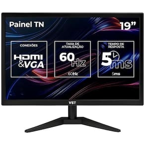 Versatilidade para Qualquer Ambiente Seja para uso doméstico ou profissional, o Monitor LED 19 VST é a escolha certa para quem busca qualidade, praticidade e design compacto. Adquira agora e transforme sua experiência visual
