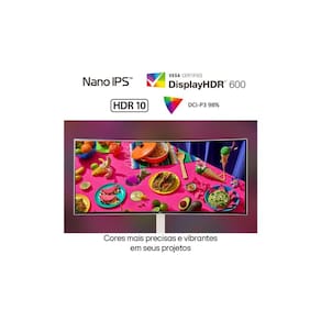 Tela Curva Nano IPS de 38” 21:9 WQHD+ (3840x1600) - VESA Display HDR 600 / DCI-P3 98% (Typ.) - IPS 1ms (GtG) de tempo de resposta / 144Hz de taxa de atualização - USB-C, LAN (RJ45), HDMI, Display Port e USB - PBP / PIP (Built-in KVM) - Ajuste de altura, inclinação e rotação lateral.