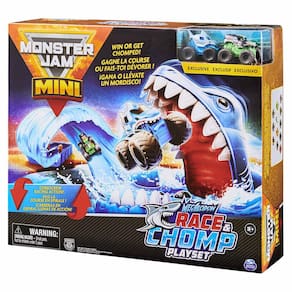 - Prepare-se para enfrentar seus mini caminhões Monster Jam favoritos com o Mini Megalodon Race e o Chomp Playset! Corrida através de uma onda perversa e em uma cabeça de tubarão gigante! Você é rápido o suficiente para atravessar a onda sem ser mordido? O playset inclui 2 Mini Monster Jam exclusivos
