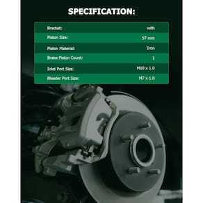 - Especificação da pinça de freio - Contagem de pistão de freio: 1 pistão; Tamanho do pistão: 5,7 cm; Tamanho da porta de entrada: M10 x 1,0; Tamanho da porta de sangria: M7 x 1,0; Suporte da pinça de freio: com; As pinças de freio são revestidas para aumentar a longevidade das peças.