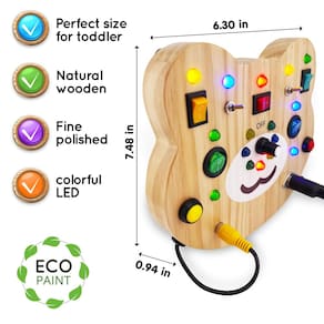 Apresentamos nosso quadro Montessori Toddler Busy, um brinquedo de madeira interativo e educativo projetado para estimular a curiosidade e a coordenação motora fina do seu filho. Com seu tamanho compacto e recursos envolventes, esta prancha ocupada é perfeita para entretenimento em movimento. O quadro mede 15,8 cm x 13,3 cm x 3,1 cm (6,22 polegadas x 5,24 polegadas x 1,22 polegadas), tornando-o conveniente para levar com você em viagens ou passeios. Ele vem em uma caixa resistente com dimensões de 14,3 cm x 17 cm x 5,8 cm (6,69 polegadas x 5,63 polegadas x 2,28 polegadas), oferecendo armazenamento seguro e fácil portabilidade. Pesando apenas 266 gramas, a prancha é leve e fácil para o seu filho manusear. Quando armazenado na caixa, o tabuleiro pesa 306 gramas, garantindo que permaneça seguro durante o transporte. Com 15 lâmpadas, 4 interruptores, 1 plugue USB, 1 relé e 1 chave, este quadro ocupado oferece uma variedade de atividades para seu filho explorar. Cada interruptor ilumina luzes LED, proporcionando estimulação sensorial e promovendo o reconhecimento de cores. Para alimentar a placa, basta desparafusar os 2 parafusos na capa com a imagem da bateria. Insira 2 pilhas AAA seguindo as instruções rotuladas no meio da caixa. Observe que as baterias não estão incluídas no kit. Feita com cuidado, esta prancha ocupada feita à mão é construída para suportar aventuras de brincadeira. Os interruptores são montados com segurança, garantindo durabilidade e segurança para o seu filho. O quadro ocupado é projetado para promover o desenvolvimento em várias áreas. Ajuda a desenvolver habilidades motoras finas à medida que seu filho se envolve com os interruptores e botões. Além disso, oferece uma oportunidade para aprender cores e promove o pensamento lógico através da atividade do interruptor rotativo. Priorizamos a segurança, e é por isso que as baterias ficam escondidas com segurança sob a tampa. Isso garante que seu filho não possa acessá-los durante a brincadeira. - Estimula brincadeiras imaginativas: desperte a imaginação do seu filho com nosso cativante quadro ocupado Montessori, acendendo histórias criativas e explorações. - Desenvolva habilidades motoras finas: deixe seu pequeno ajustar suas habilidades motoras enquanto manipulam interruptores, botões e cabos, promovendo coordenação e destreza. - Estimula o pensamento lógico: veja como seu filho desbloqueia o segredo de causa e efeito enquanto experimenta os recursos interativos, incentivando o raciocínio lógico. - Perfeito para diversão em movimento: projetado com portabilidade em mente, nosso tabuleiro ocupado leve oferece entretenimento e valor educacional onde quer que suas aventuras o levem. - Qualidade premium e durabilidade: trabalhada com atenção meticulosa aos detalhes e usando materiais de alta qualidade, nosso Busy Board resiste ao jogo entusiasmado para diversão duradoura.