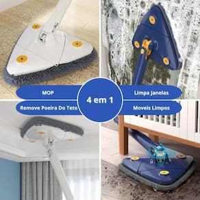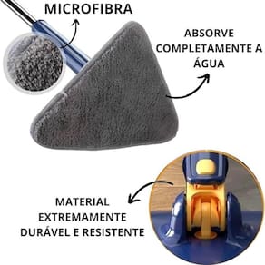 Design compacto, desmontável, simples e conveniente de usar; Economize tempo e esforço na hora de fazer a faxina em casa; Rotação de 360 remove toda a sujeira em uma única passada; Esfregão com cabeça triangular facilita a limpeza e alcança até os cantinhos mais altos e difíceis de limpar; Sistema inovador de torção separa a água suja da limpa, mantendo suas mãos longe da sujeira e dos produtos químicos; Não precisa torcer nem secar os panos sujos; Microfibra de alta absorção limpa e seca de forma eficaz todo tipo de piso. O que vem na Embalagem: