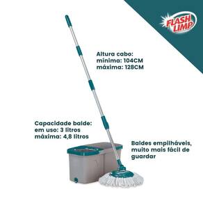 Ele possui base flexível o que garante a limpeza em áreas de difícil acesso como cantos e quinas. Além disso, o mop giratório duas águas flash limp acompanha dois baldes empilháveis, facilitando na hora de guardar. O balde de água tem capacidade em uso de 3 litros e capacidade total de 4,8 litros.