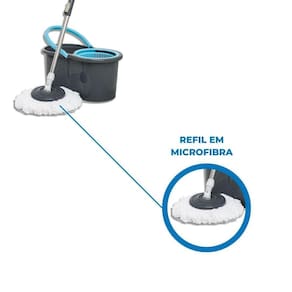Mantém as mãos longe dos produtos químicos, água e sujeira; lavagem prática do esfregão; remoção do excesso de água; cabo de inox superleve com 1,2m e inclinação de 180 para facilitar a limpeza de lugares estreitos e de difícil alcance, como: tetos, janelas e embaixo dos móveis. Balde com com capacidade de 13l e alça que facilita o transporte. Cor: cinza e azul