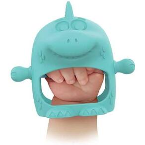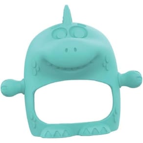 O formato de luvinha ajuda no desenvolvimento da coordenação motora fina do bebê ao segurar e manipular o mordedor.