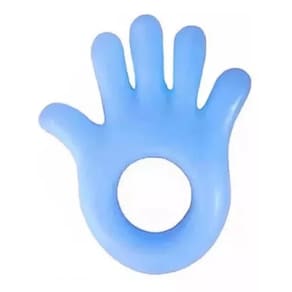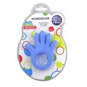 Este mordedor é feito de material macio e seguro para bebês, sem qualquer substância tóxica. Ele possui um formato de mãozinha azul, com texturas diferentes que ajudam a massagear as gengivas do bebê, oferecendo alívio para os dentes em crescimento.